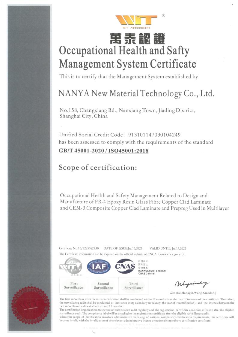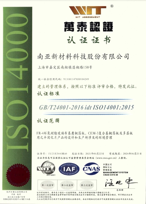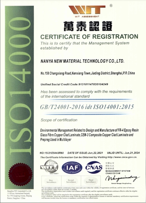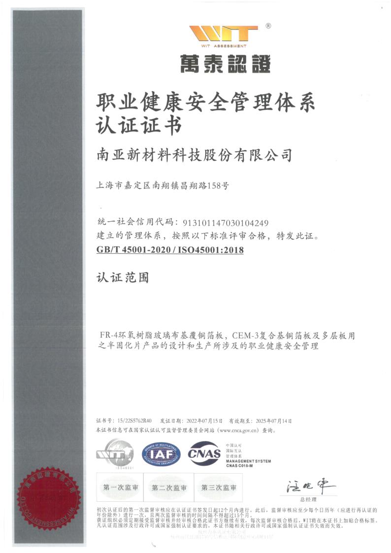 南亞新材始終堅持質量就是生命,持續不斷的改進生產技術和服務水平,不斷完善質量管理體系,務求滿足并超越不同客戶的要求和期望;經過不懈的努力,公司先后通過了ISO9001質量管理體系、 ISO14001環境管理體系和ISO45001職業健康安全管理體系的認證及改版升級。
